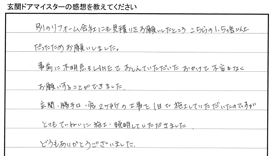 「玄関、勝手口、窓2か所の工事を1日で施工していただいたのですが、とてもていねいに施工、説明していただきました。」