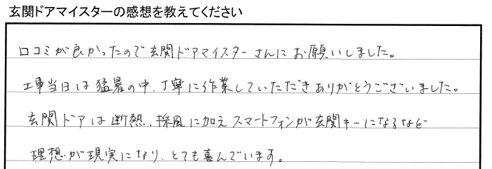 「クチコミが良かったので玄関ドアマイスターさんにお願いしました。(選んだ決め手は)下請けを使わない自社施工なので安心して任せられそうだった点です。」