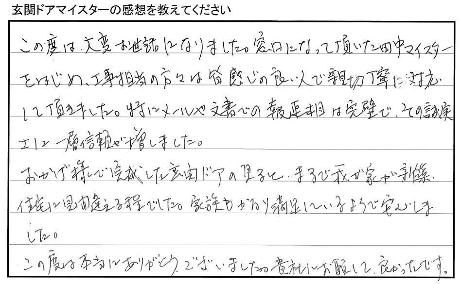 「おかげ様で完成した玄関ドアを見ると、**まるで我が家が新築住宅に見間違える程でした。**家族もかなり満足しているようで安心しました。」