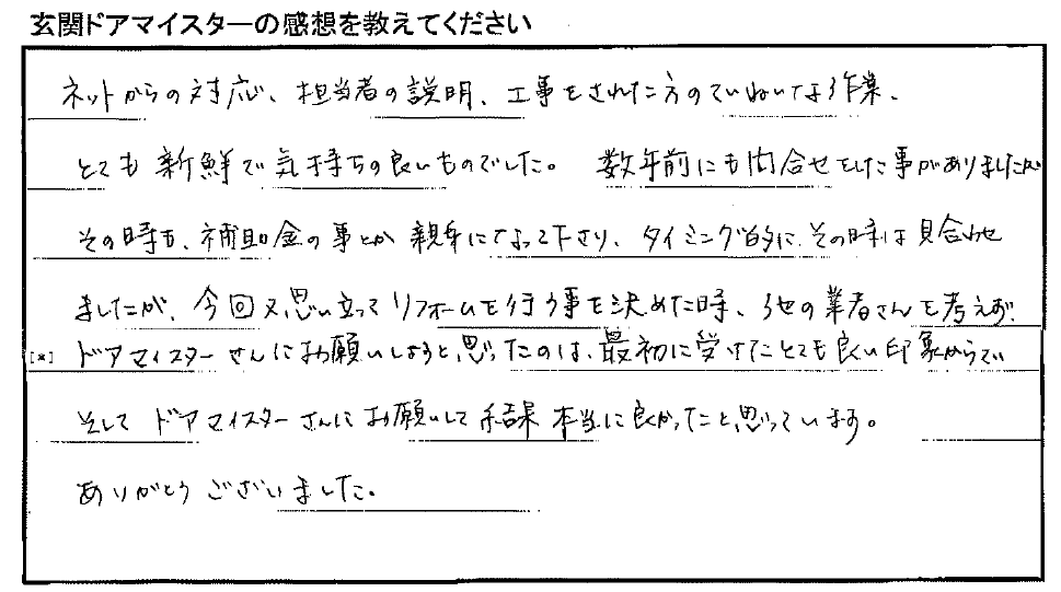 「数年前にも問合せをした事がありましたがその時も、補助金の事とか親身になって下さり、タイミング的にその時は見合わせましたが、今回又、思い立ってリフォームを行う事を決めた時、他の業者さんを考えずドアマイスターさんにお願いしようと思ったのは、最初に受けたとても良い印象からです。」