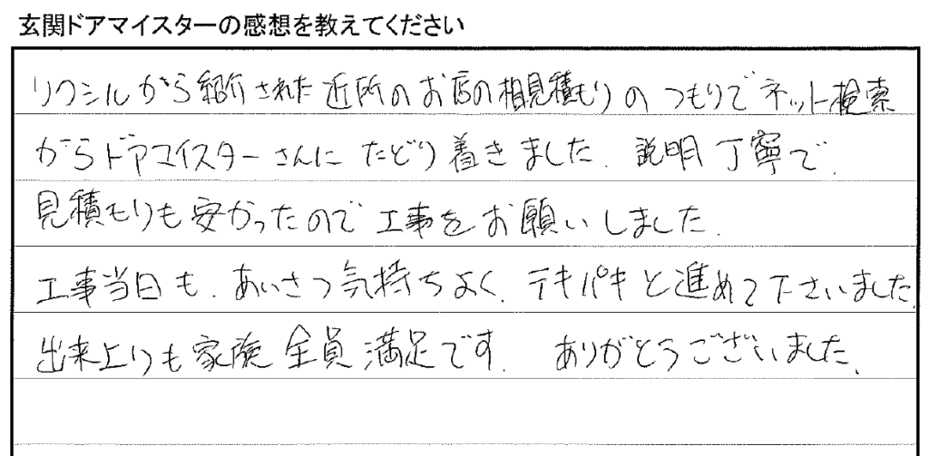 「リクシルから紹介された近所のお店の相見積もりのつもりでネット検索からドアマイスターさんにたどり着きました。説明丁寧で、見積もりも安かったので工事をお願いしました。