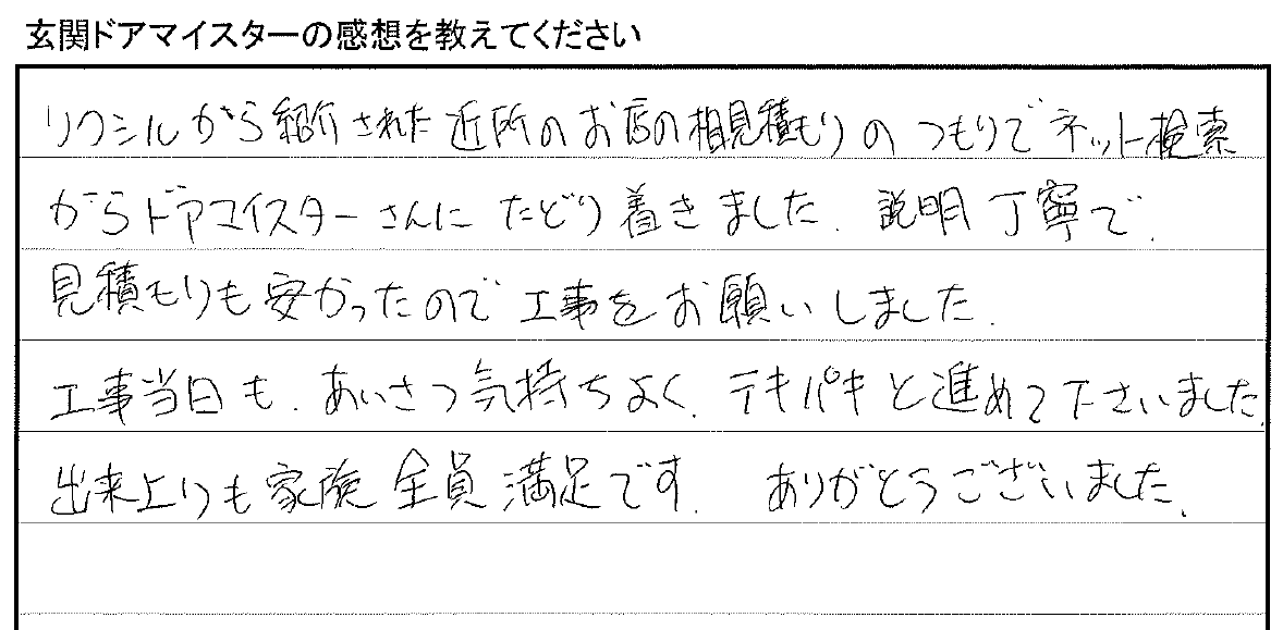 「工事当日も、**あいさつ気持ちよく、テキパキと進めて下さいました。出来上りも家族全員満足です。**ありがとうございました。」