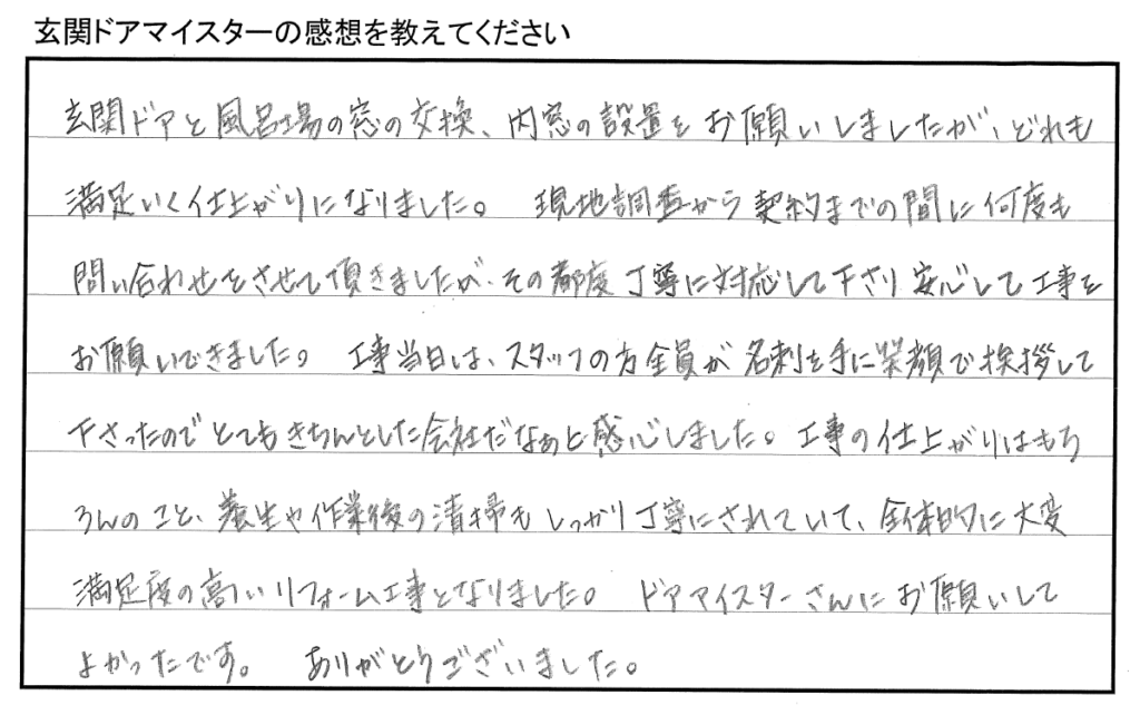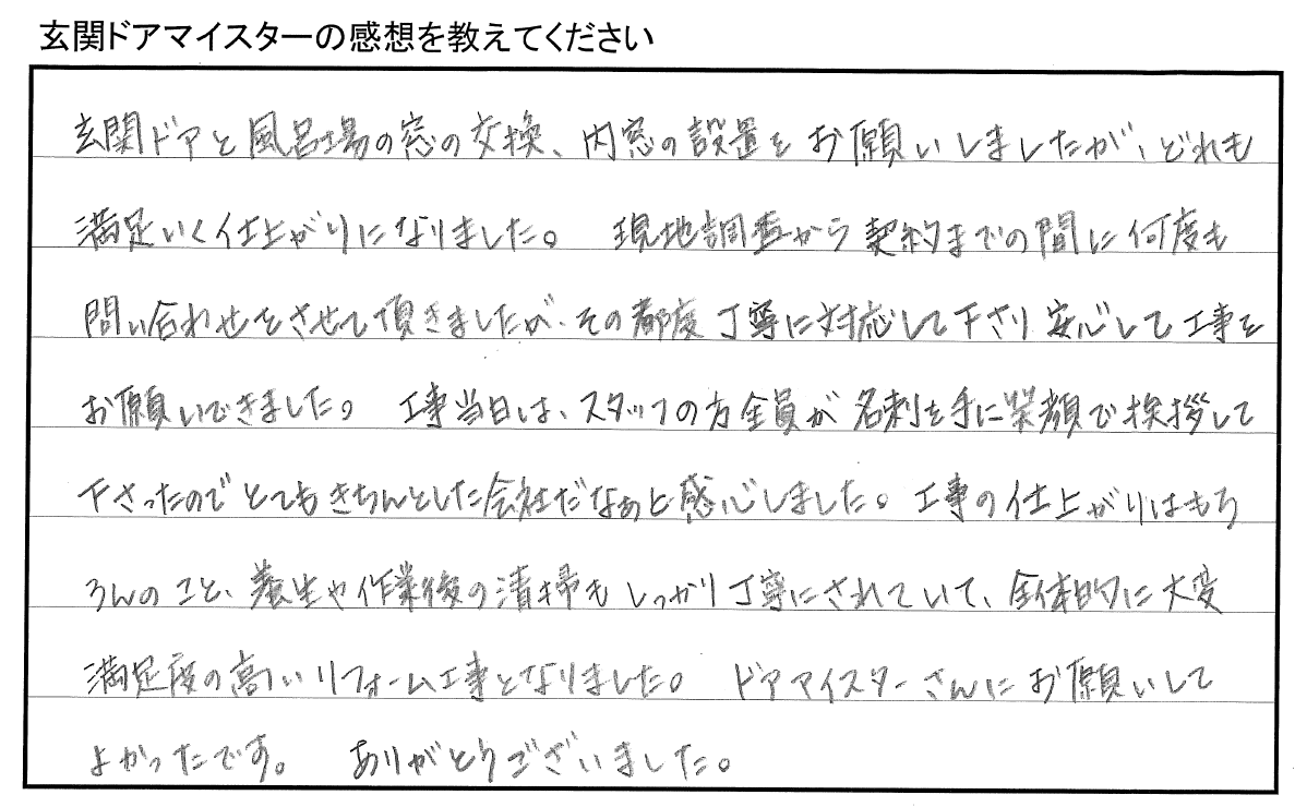「工事当日は、スタッフの方全員が名刺を手に笑顔で挨拶して下さったのでとてもきちんとした会社だなあと感心しました。