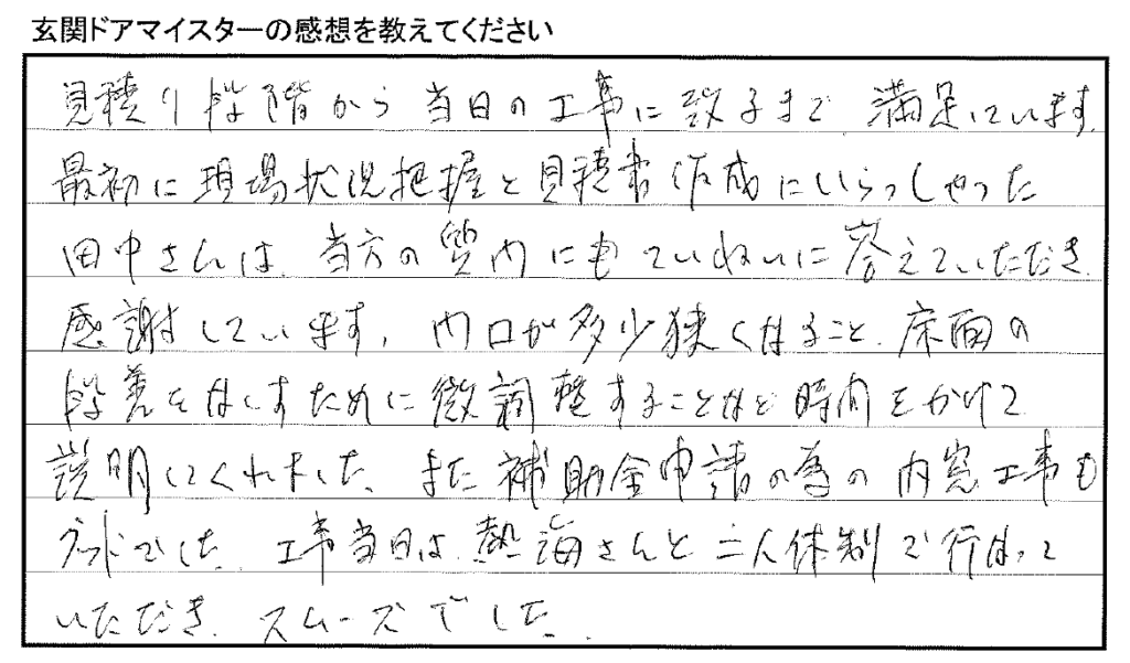 「見積り段階から当日の工事に至るまで満足しています。最初に現場状況把握と見積書作成にいらっしゃった田中さんは、当方の質問にもていねいに答えていただき、感謝しています。内口が多少狭くなること、床面の段差をなくすために微調整することなど時間をかけて説明してくれました。」