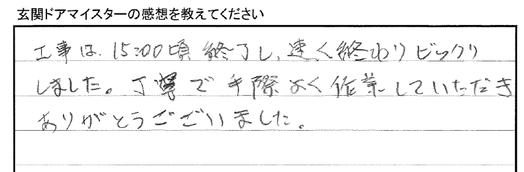 「工事は、15:00頃 終了し、速く終わりビックリしました。丁寧で手際よく作業していただきありがとうございました。」
