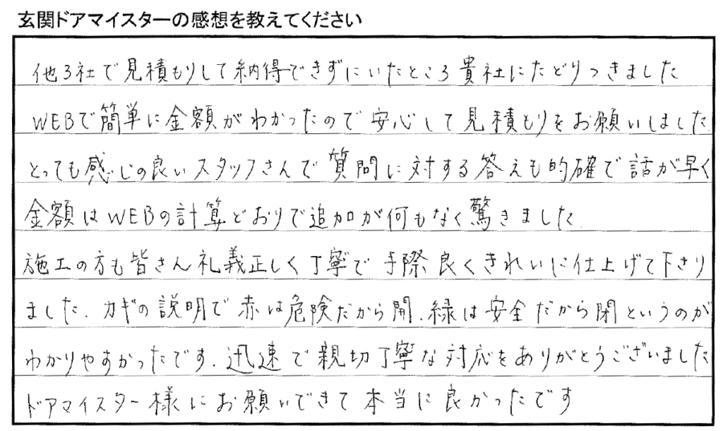 「他3社で見積もりして納得できずにいたところ貴社にたどりつきました。WEBで簡単に全額がわかったので安心して見積もりをお願いしました。とても感じの良いスタッフさんで質問に対する答えも的確で話が早く全額はWEBの計算通りで追加が何もなく驚きました。施工の方も礼儀正しく丁寧で手際よくきれいに仕上げてくださいました。ドアマイスター様にお願いして本当に良かったです。」