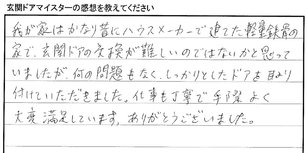 「我が家はかなり昔にハウスメーカーで建てた軽量鉄骨の家で、玄関ドアの交換が難しいのではないかと思っていましたが、何の問題もなく、しっかりとしたドアを取り付けていただきました。」